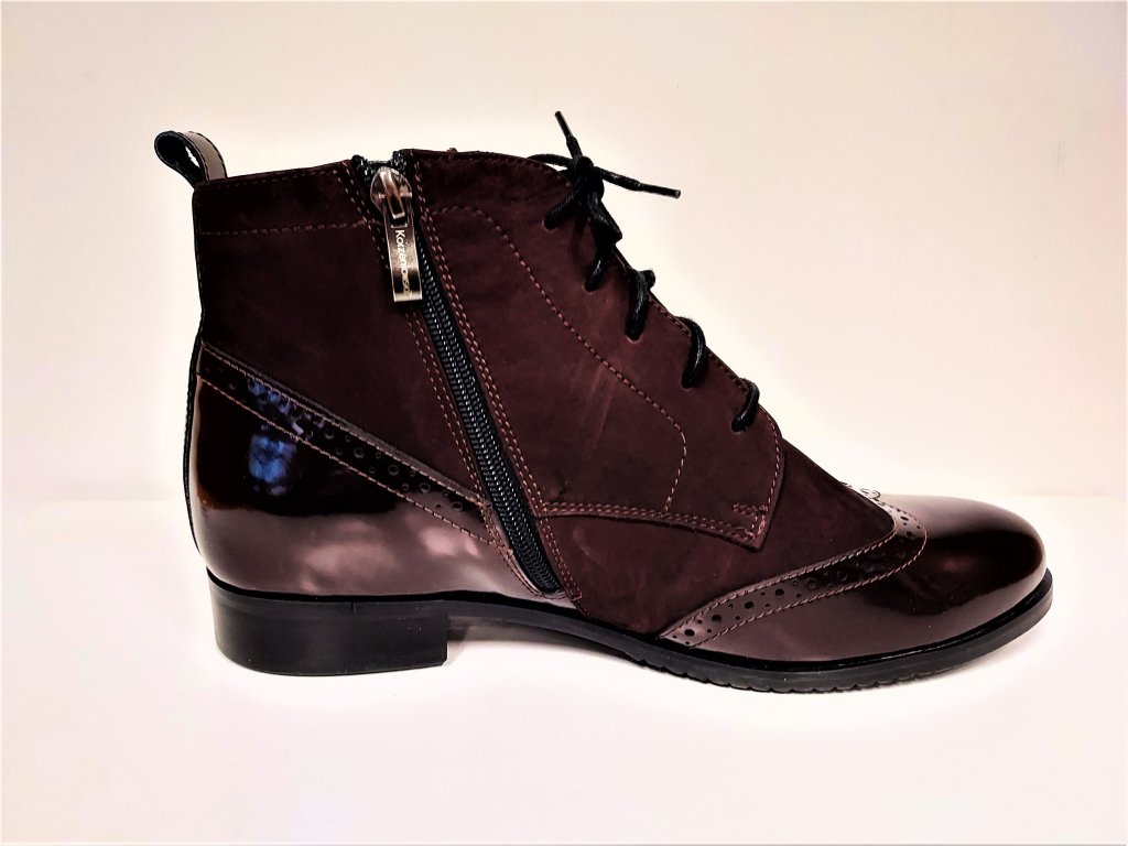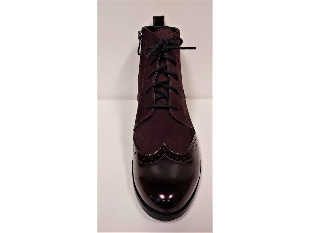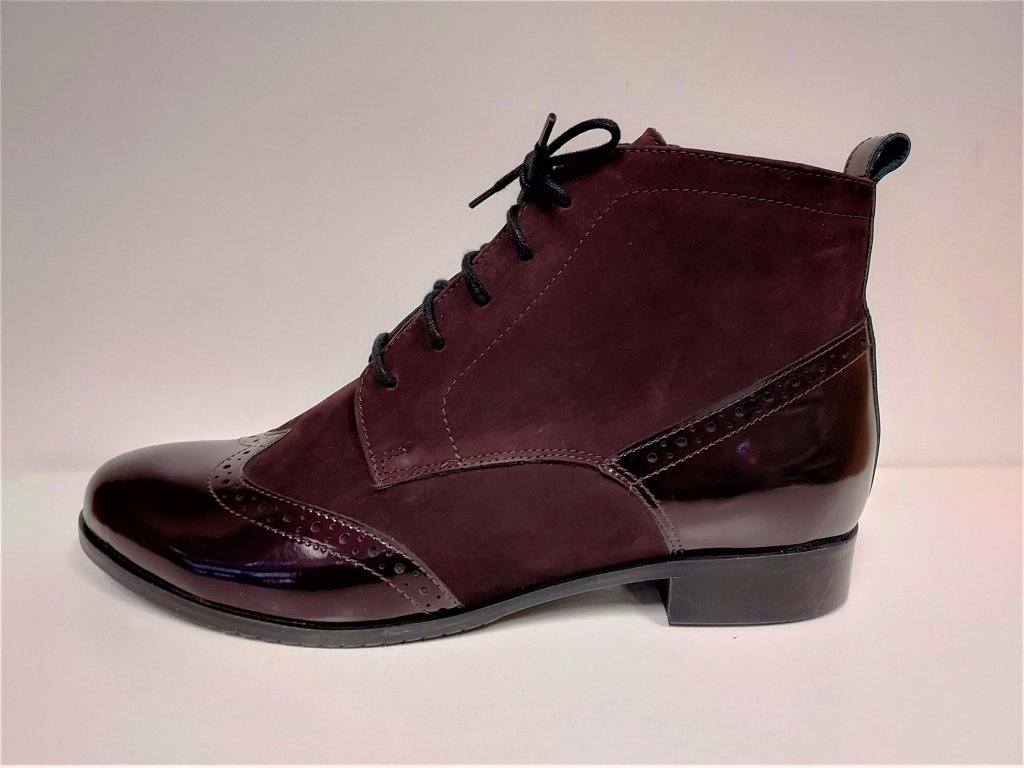 Obuv je vyrobena z KŮŽE. Atraktivní kombinace lakovaných materiálů v bordo barvě, doplněna polo broušenou kůží, dělají obuv velmi estetickou.